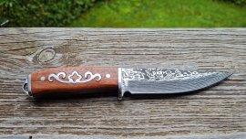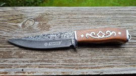 It is an outdoor knife with a solid blade with a finish imitating damascus steel and a decorated wooden handle.