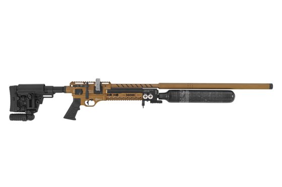 The Turkish airgun manufacturer Hatsan comes with a tactically tuned Factor Sniper S airgun in a neat sand colour scheme FDE, which has an externally adjustable pressure regulator and hammer spring tension.