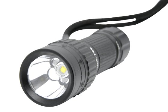 Rugged handheld flashlight with waterproof aluminium body (IPX 4) equipped with CREE XPG LED. Its light beam can be switched in three modes (strong 350 lm, weak 120 lm, strobe).